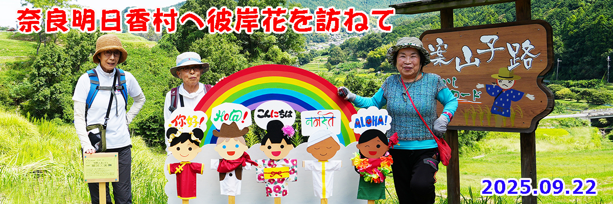 さあ健脚組と自転車組のスタートです。いつもなら九品寺か一言神社が恒例なのですが今年は気分を変えて明日香村にしました。万が一曼珠沙華が咲いてなくても素晴らしいコースです。 |