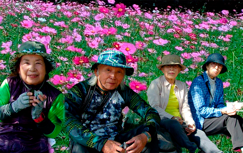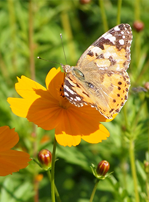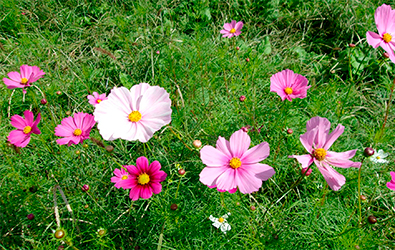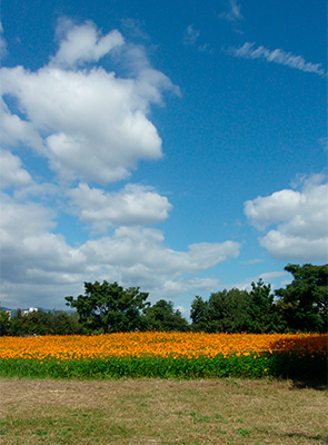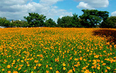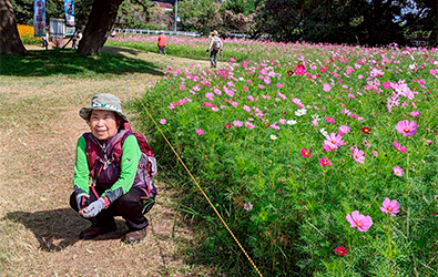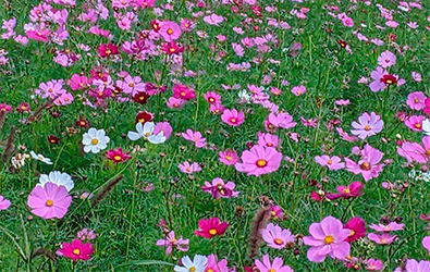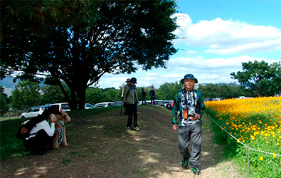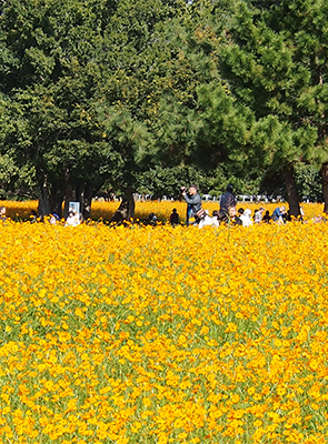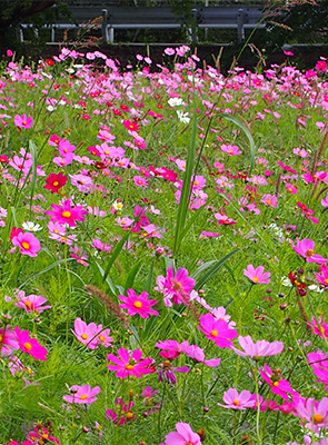 | 初めに目に入ったのは黄色のお花畑でした「これってコスモスなの?」ちょっとイメージが狂ってしまいましたがキバナコスモスというらしいです。キバナコスモスの遥か向こうに色とりどりの可憐なコスモスが私達の来るのを待っていたかの様に綺麗に咲いていて満開です。まさに秋の桜です。 |