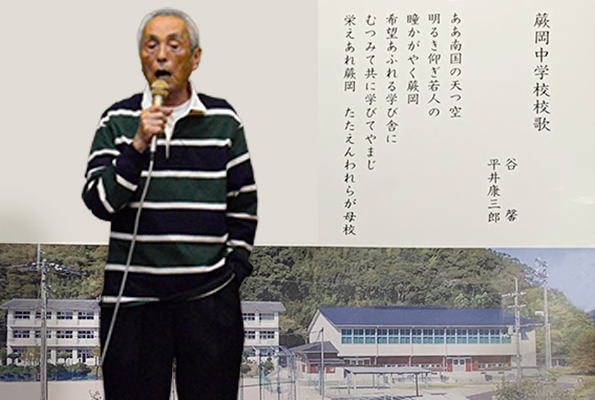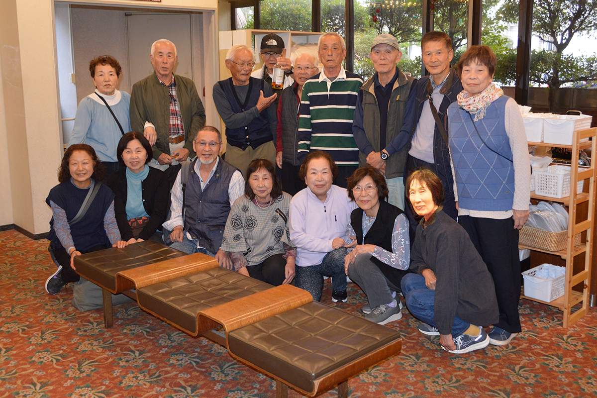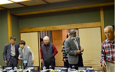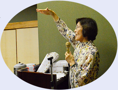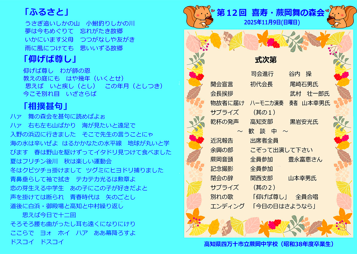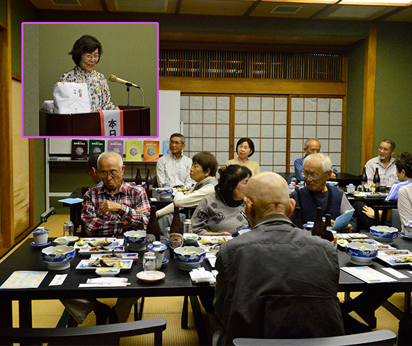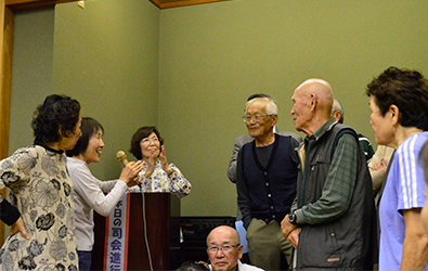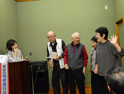 | プログラムには舞の森の名前のいわれ、歴代の旅行地、そして19名の物故者の栞も用意しています。司会者は関西支部長の操さん、今迄にないスタイルに少し戸惑いもあったかも知れませんが最後なので式次第に乗っ取り粛々と進めることにしました。うぐいすの様な可憐な声で開会宣言、続いて武村会長の挨拶です。マイクを渡すと、おもむろに原稿を出し「真面目モード」の挨拶、第1回目からの苦労、生徒数、担任の先生の名前とそれはそれは素晴らしい内容でした。部屋にこもり一生懸命考えて下さったんだと思います。 |