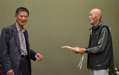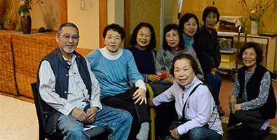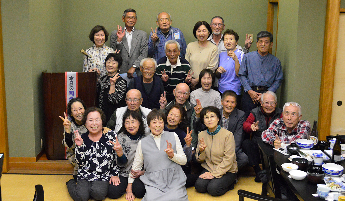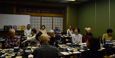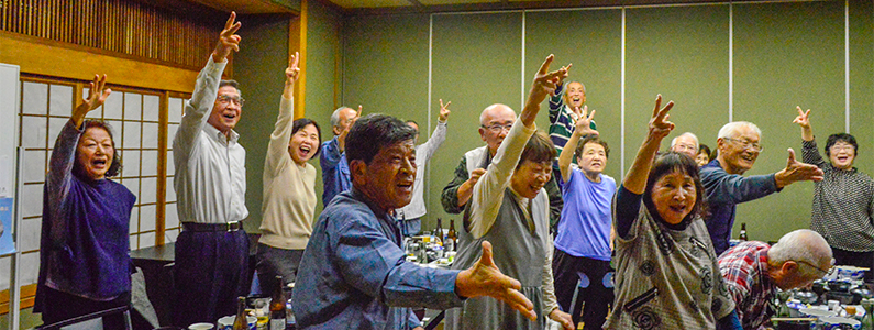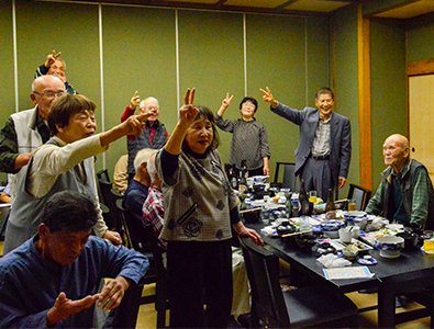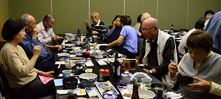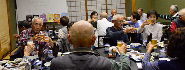 | ほどよい時間が経ち近況報告の時間となりました。順番に全員の近況報告が始まりました。農作業をしている人が多く、玉ねぎを200本植えた、オレは300本だのニワトリを飼っている人もいました。パイナップルが芽を出したという人もいました。腰が痛いだの耳が遠くなりにけりだと賑やかでした。 |