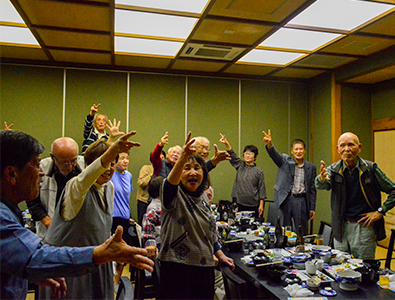 富恵師匠を先頭に全員参加で輪を作り別れの寂しさを隠す様に元気に踊りました。記念撮影は舞台に集まってもらいホテルのスタッフを呼びシャッターを押してもらいました。