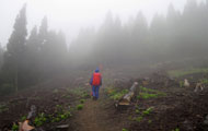 | 小雨は降っているもののブナの林は私達にやさしく、大きな樹木が雨避けカーテンとなり、昼食も雨を気にすることなく美味しくたべることができました。自然ってありがたいよねといいながらも電波塔あたりを通過するときは強風が吹き帽子を飛ばされる人もいましたが「南八ヶ岳の根石岳の風にくらべたらへっちゃら〜へっちゃら〜」とたくましい言葉を発しながら強風を避けるために木立の中に急ぎました。天気がよければ琵琶湖や若狭湾など見えるのかなぁと、それだけは残念に思いましたが、価値のあるコースにみんな大満足でした。ゴールの黒河峠がもうすぐだよと言わんばかりに私達の前に大きな蛙が飛び出てきて、くろねこ隊長が「カエルだよ」と教えてくれました。カメラに収まる蛙はモデルの様に足も手を伸ばしポーズを取っているように見受けられました。………………………………↓ |