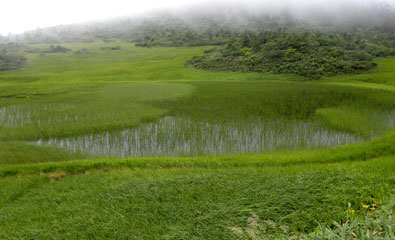 | 食事をしたり写真を撮ったり八甲田を十分楽しんで仙人岱に向けて下山開始です。この頃から少しずつ晴れ間が広がってきました。鏡沼を過ぎる頃には、八甲田小岳や酸ケ湯温泉などきれいに見えるようになってきました。晴れた。登りと違って風も無く南八甲田の峰峰を楽しみながらの下山です。仙人岱避難小屋を見ながら数組の家族が楽しんでいる仙人岱を通り、だらだらと地獄湯ノ沢沿いに下っていくと酸ケ湯温泉登山口に到着です。 | |||