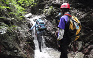 | 途中10メートルの滝で一度登ったのですが懸垂下降を楽しもうと言うことになり、一人づつ滝の中を懸垂下降で降り、プルージックで登ります。水しぶきを浴びながら岩場とは違ったスリルがありました。もうこれが最後かと思うところに15メートル、10メートルの2段の滝が待ち受けていました。ロープで確保しながら安全に沢登りを堪能することができました。 | |