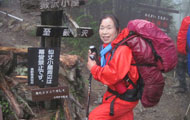 朝5時、曇り空の薄暗い中、「一足お先に」チームは仙丈岳3032.6bに向けて出発しました。出発点である大平山荘のすぐ横に登山口があり藪沢新道を通って行くことにしました。1週間前までは残雪があり通行止めとなっていましたが、幸いな事に私達はこの薮沢新道を登ることができます。荷物は預けないで全部背負って行って行くことになります。朝食は前日と同じように昨夜頂いた弁当を出発前に腹にかき込み、あとは行動食とうまく組み合わせます。合羽は着ないで出発しましたが30分も登らない間に、また嫌な雨が降ってきました。最終バスの午後4時には何としても北沢峠に到着しておかなければならないことを念頭に置いて、登り始めましたが風雨が強くなり、視界も悪く、今日も頂上を踏むことは出来そうにもありません。
