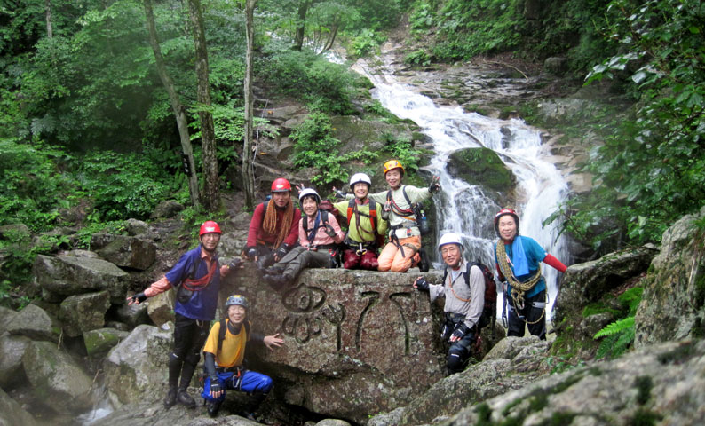 「まず、手と足を濡らして水に慣らして〜」のリーダーの指示で水の中へ。「つ〜め〜た〜ッ!」と声をあげながらも、子供みたいにキャーキャー言いながらも、一度水に濡れてしまえば平気です。 少し雨が降ってきた様ですが、へっちゃら、へっちゃら。 滑らぬ様に、滝があれば小さくても滝登りを楽しみます。しばらく登っていくと「魚止の滝」に出ました。 6メートルほどあるでしょうか。この滝は去年初めての沢レンジャー部隊員となったとき、いきなり滝壺の中を泳ぐように岩に取り付いた思い出があります。 この魚止の滝こそ60歳を過ぎてから「沢登りは楽しい」と体験させてくれた滝です。 水量は多いものの「登るか?」のリーダーの声に「ハイ」と即回答しました。おっかないと思う人は滝を巻いて安全コースを登ります。 ロープをかけてもらい安全対策を忘れることはありません。 |
