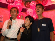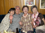 | 楽しかった様子は、活字より写真を見て頂ければ「あ〜参加できずに残念やったなぁ」と思って頂けると思います。ドタキャン正ちゃんはみんなからお灸を据えられ私の怒りも、正ちゃんが扮装して歌うという罰ゲームもどきで勘弁してあげることにしました。 「正ちゃん!あんたが祝ってもらうんやから、もっと早く来ないといかんよ」 「ドタキャンはいかんよ。仕事もエエけど、友達なくすで〜」 「姫さんが怖いんか、おべっか使ってる〜」と散々いらわれていました。(あ〜あ。スーッとしたわ。みんなの代弁に感謝) |