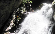| 「お弁当にしよう」といったのが午後1時20分。午後はまだ半分以上残っています。昼食後も、それぞれが気の向くままの水の中コース、岩場コースを楽しみました。コースが長いため少し疲れが出て来たのかスピードが落ちてきました。朝の渋滞で出発が1時間30分も出遅れているために、日没にならなければいいがとジョンの心にあせりがでで来ました。懸垂下降をする箇所があり「ATCをセットして!」「持ってきていません」そうこうしていると「ATCを落としました」もうジョンの顔色が変わっています。下山の登山道は悪路続きで、何としても暗くならない間に駐車場に帰らなければなりません。姫がビレイをして引き上げている間にジョンが次ぎのセットをして時間短縮を試みました。 |