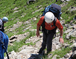 | カニのヨコバイや前剱あたりはどうにか足が進んでいたが、途中のケルンのある広場では、ほとんど脱水状態だった。みなとさんに水をもらい、会長に水をもらって凌ぐが一服剱のコルでは待った足が動かなくなってしまった。ゆあささんとせんせいに荷物を軽減してもらい どうにか一服剱の上に立つことが出来た。一服剱の上にあった茶色くなった雪の塊を会長からもらい ボンの窪を冷やす。すこし楽になってきた。 ここからは剣山荘が見える。20分もあれば下りきるだろう。歩くほどに山荘が大きく見えてくる。なんとか陽のあるうちに下山できそうだ。 別山尾根を下りカニのヨコバイから前剱、一服剱と通って剣山荘に辿り着いたときには陽は西に傾いていた。水分切れでヘロヘロ、此処でオレンジジュースを買い求め一気に流し込んだ。それでも水分切れした体は元に戻らない。これからテント場まで30分はかかる、途中沢の水をヘルメットで汲んで頭からかぶるがまったく効果なし。それでも何とかパーティについて歩き 新しくなった剣沢小屋に到着。 |