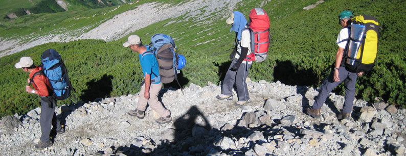 | 【編集後記】 今回の剱岳・源次郎尾根山行は突然降って沸いたような話しだった。このルートの厳しさは充分に承知していたし、参加メンバーの実力からして迷惑を掛けないで付いて行ければいいと考えていた。 剱岳は過去に3回経験があったのだが、山行経路がいずれも別山尾根だった。今回は剣沢を凡そ400mの標高差を下り、凡そ1000mの標高差を上昇するには きついものを感じていた。 源次郎尾根ルートの前半はほとんど手足で登っていくため、足への負担が軽減されたのだろうが、もし標高差1000mの急登を足だけで登るとしたら、とても付いて行けなかっただろう。携行する飲料水の少なさにも問題があったと思う、もしもう500ml多く携行していて上手に給水していたら、一服剱のコルから一服剱頭まではどうにか迷惑を掛けずに上がれたのではないか思う。 山行の楽しさは 体力、体調、歩行速度、携行重量などで決まってくるので、皆さんも今後の山行の礎にしていただければ幸いです。 やまたび倶楽部の皆さんには、山行には体力、知識、技術、装備、知恵、勘というものが必要だと常々申し上げていますが、絶対に必要なものは体力です。其処のところを再度認識してください。単独行は自分の体力に合わせてゆっくりのんびり行けると言う利点もありますが、その裏に数倍の危険が潜んでいます。 「行きたい山と行ける山」 行きたい山があるならそれに見合ったトレーニングをして、パートナーを探してから入山してください。 |