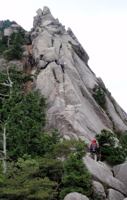 湯ノ山温泉の街越しに伊勢湾方向をに目を遣ると視界は十分に開けていた。「天気は大丈夫だ」全員気合をいれて準備にとりかかった。 御在所岳・裏道は壊滅状態だった。平成20年9月2日〜3日にかけての三重県北部の集中豪雨で三滝川上流北谷は酷く荒れていた。昔の面影はまったく無く濁流に掘り起こされ、洗い流されてきた白い岩が転がっていた。もう一年もなるというのに、まるで昨日の出来事のように感じた。 昨年9月12日〜15日北岳バットレス・第4尾根主稜登攀を予定していたとき、トレーニングの一環で、一週間前の9月6日(土)に籐内壁・前尾根の登攀を予定していたが、雨天のため中止したことが記憶に蘇ってきた。ちょうどその3日前の豪雨にやられたのだ。 北岳バットレス・第4尾根登攀時に名古屋のガイド氏から藤内小屋の荒廃は聞かされていたが、こんなに酷いものとは思っていなかった。 藤内小屋到着。小屋の前には新しい木材が積まれ、小屋の再建を待っているようである。小屋前の広場では多くの登山者が休んでいた。ある者は水を口に含み、またある者はストーブにコッフェルをのせ朝食の用意をしていた。ここでしばらく休憩を摂り更に奥を目指した。 北谷の荒れようはそれまでに増して酷いものになっていた。V字谷は左右が削られその土石が中央部に載積されているため川幅は昔に比べて大きく拡がっていた。大石を縫うように歩いて藤内沢の出合を目指す。川原に積まれたケルンが目印になった。 小屋から僅かな所にある岩塔はウサギの耳と呼ばれており藤内にあるフリールートの中ではよく登られているところである。この岩塔の基部も抉り取られ5mほど取り付き点が下がっていたが 昔ながらに凜として聳えていた。 ←ウサギの耳岩 (よく見るとウサギが横を向いているように見えるかな) |