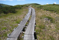 | 9月6日(日曜日) 午前5時薬師岳登山組の出発時間です。東の空は薄っすらと茜色。今日も天気は良さそうです。全行程、たいした雨にも遭わず山行が楽しめるなんて久しぶりです。 靖っちゃんとねこちゃんは一時間遅れで薬師岳小屋を目指します。他のメンバーは太郎岳山頂を散策しゆっくりと下山をする予定です。 サブリュックに水とレーション、合羽を入れ、ジョン、オリオン、サスケ、姫の4名が頂上を目指して午前5時05分小屋前を出発しました。 朝露に濡れた木道はズルズルと滑ります、膝を高めに上げ上から押し込むように歩いていかないとすぐにズルッ。歩きにくい木道を薬師峠に向けて下っていきます。薬師峠のテント場はずでに目覚めている様子。朝食の準備をしている者、朝食を口元に運んでいる者、テントを片付けている者などさまざまな時間を過ごしている。そんな登山者を尻目に峠から涸れ沢へと入っていきます。 |