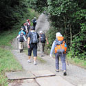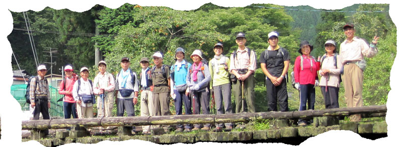 | 二ノ瀬駅付近で午後13時、ギリギリですが、あとは下りが多いので何とか山幸橋まで行けそうです。夜泣峠で記念撮影、夜泣峠のいわれを読みたかったんですが時間がないため割愛、向山頂上(428メートル)で14時02分、バスに間に合うかどうかきわどいところとなりました。午後からは少しスピードが早く、前半グループと後半グループに別れた形となりましたが、バスの時間を気にして、あせっての事だろうと理解してみんな無言で歩き続けました。ダイトレでもそうでしたが、バスの時間に合わせてのゴールにはつらいものがあります。車の音が聞こえてきました。 |