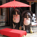 | しばらくすると、いきなり騒がしい町並みに入りました。いつの間にかもう鞍馬の街に出た様です。鞍馬寺の前で記念撮影をし、車道の脇の空き地で昼食をとることにしました。時間は12時40分、ジョンが「山幸橋まで突っ走るぞ」と合図を送ってきましたので承諾しました。お昼の歌を歌っていてバスに乗り遅れたとあっては今後の活動に影響します。ここは急いで身支度を整え午後のコースへと進むことにしました。 |