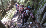 | 鬱蒼と茂る樹林帯を登っていきます | 途中、いくつもの枝沢を渡ります | 滝への分岐で一休み |