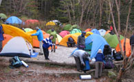 | 「さあ寝ようか」と時計をみたら午後5時・・・今から寝たら朝までが長すぎるのですが外は寒く、テントの中の温度も5度しかありません。寝袋にくるまって寝るしかないのです。しばらくすると「プーッ、プーッ」と狭いテントの中でラッパが鳴り響きます。「酸欠になるからこんな狭いところでせんといて〜!」姫の悲鳴は隣のサスケテントまで聞こえていたようです。ポツンポツンとしか張られていなかったテントも夜トイレに行く頃には満杯で足の踏み場もありません。ロープに足をかけないように注意してトイレの列に並びます。空は満点の星が輝き、明日の晴天を約束してくれました。 |