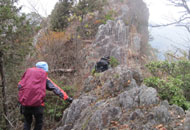 | 右を見ても、左を見ても美しく彩る紅葉は、ここへ足を運んだ者達へのご褒美のように「絵にも描けない美しさ」を堪能させてくれました。「シャレ滝」、「大滝」、「二の滝」、「一の滝」と標高差200メートルの間に8つの滝が続く、まれにみる滝スポットです。この場所は電車の便が悪く、今日の登山者は我々だけで「貸し切り状態」でした。 「滝道終了」の看板を見て岩場を駆け上がりますが、みんなラクラクと登っていきました。500メートル級の山であっても岩場通過時にはクライミングの技術が役立ちます。 |