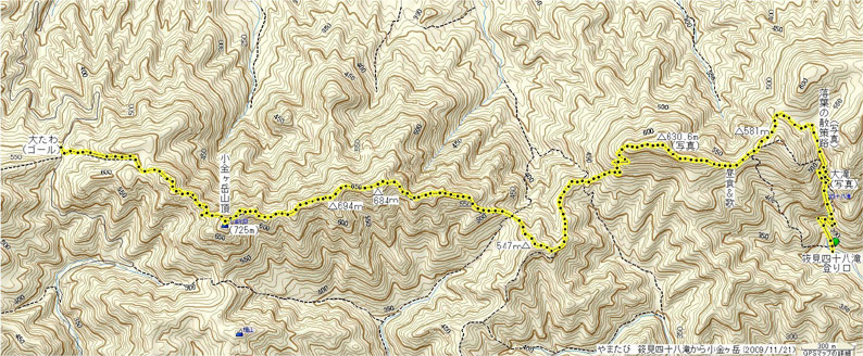 | 能勢の道の駅集合午前9時00分、別々の場所から発車したにもかかわらず、オリオン号と四万十号は、ほぼ同時に到着しました。朝の挨拶もそこそこに「筱見48滝」に向けて車を連ねます。三連休とあって車は多いものの、さほど渋滞には至っておらず、筱見48滝途中の酒造会社の近くでドライバー以外は車を降りて歩き、2台の車はゴールの場所・大タワへ走り1台は駐車場に停めて1台は滝へ戻ってきました。全員が揃ったところで午前10時30分には出発することができました。 「その手では筱見48滝から小金ケ岳登山は無理やろ?」ジョンからそんな打診を受けましたが「大丈夫!この間の妙義山からの下山に比べたら行ける!」と言ったものの、いざ登り始めると滝近くは石が滑り、岩場は鎖がかかっておりジョンにシュリンゲをかけてもらい手間をとらせることとなり、自分のわがままで参加をしたものの迷惑をかける登山となりました。しかし障害者をフォローして登る訓練だと思えば技術向上になるかなぁとプラス志向に考えて、下りを中心にフォローしてもらうことにしました。この間の怪我からか、恐怖心がまだあり、下りは、なかなか足が前に進まない状態も度々ありました。 歩き初めてすぐ「手洗い滝」、次に「弁天滝」、その上にかぶさるように「肩の滝」を見ることができました。水量もあり紅葉も美しく、感嘆の声をあげながら「長滝」までやってきました。登山道から下に降りて滝見物となるため、足場も悪く、姫はここで待機することにしました。 |