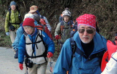 | 葛木神社のすぐ手前でのことです。突然白い木々が現れました。「うわっ、樹氷や」「ちゃうちゃう、霧氷や」樹氷か霧氷かどっちでもいいのです。今までの殺風景な景色がおとぎの国に変わったよう。魔法使いの杖の一振りで回りが凍り付いた感じです。 細い枝をよく見るとその白い氷は小さいながらもあの蔵王で見たエビのしっぽの形をしています。晴れた空を覆う杉の葉っぱからはキラキラ光る氷の粒がパラパラと降り落ち続けています。上を見上げてこっちでは「ああ奇麗」あっちでは「あっ痛」、氷のかけらが顔に当たったようです。そう言えばさっきからうららの肩や帽子にもポツポツと当たっています。 |