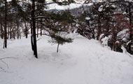 | マキノスキー場の奥部で調子の滝方面に行く途中に赤坂遊歩道の登山口がある。標識があるので良く見て取り付く。ブナ林の中をゆっくりと進んでいくと1時間ほどでブナの木平のあずま屋に着く。雪に覆われていて全景を目にすることは出来ないが、屋根を覆う雪と降り積もった雪の間に中に入っていけるくらいの穴がある。風のきつい日や緊急のビバーグには役に立つだろう。 ここからしばらくいくと左側に沢筋を見るように進む。石積みの堰堤を左岸から越えると少し急な九十九折のトレースを辿る。あずま屋から1時間ほどで高圧線鉄塔のある平原につく。此処は粟柄越、道標は雪ノ下で明確ではないが間違いは無いだろう。右手奥の台地の向こうに赤坂山の頂上が確認できる。頂上までは20分ほど。 |