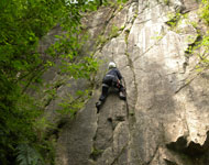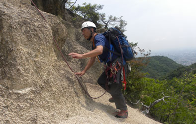ここで休憩を取りA懸岩から少し下りたらC懸尾根に抜ける道を進んでいきました。この道はあまり踏み跡がなく蜘蛛の巣が張ってありトップを歩くと顔に蜘蛛の巣がかってしまうので、木の枝で払いながらC懸垂岩へ到着しました。「先に行って上でビレイしてくれ」とジョンに言われ、一番下っ端である姫が急斜面を登り松の木の枝を利用し上からGIGIでビレイを始めました「どうぞ〜」順調に登攀終了です。ロープに関する疑問点はその都度質問し、別の方法がある時はその説明をしたりで思わぬ時間が経過していきました。ブラックフェイス、キャッスルウオール、岩梯子も廻る予定でしたが「前半」「後半」と分けることにし中身の濃いトレーニングをすることにしました。C懸尾根からは少し手ごわい空中懸垂が待っていました。