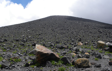 | 浅間山へのアプローチは想像以上に長くつらかったです。火山館からがいよいよ浅間山への取り付きのはじまりです。樹林帯を30分ほどで抜けると大きな看板がありました。ここからは危険地帯であること、現在は「レベル1」のため前掛山まで登れること、自己責任で登山することなどが書かれていました。30分ほどで樹林帯を抜けると目の前の景色が変わってきました。ドドーンと浅間山が姿を現したのです。「え〜っあれを登るの?」思わず叫びました。浅間山2568bの雄姿を見た途端、今までの疲れが吹っ飛びました。すでに下山してくる人もあり、かなり朝早く車坂峠を出発した様子です。 |