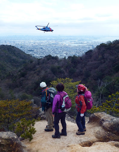 | 小便滝あたりでお巡りさんが本部と無線で連絡し、確保された子どもの場所を確認しています。 防災へり、麓の滝の茶屋前にはパトカー3台、広域消防車3台、救急車2台出動していました。子どもの「助けて〜」の叫び声に状況を判断することなく「110番通報」をして大騒動となりました。親は保久良神社に向けて下山し、子どもは他の登山者に風吹き岩周辺で確保されていたらしいです。 |
