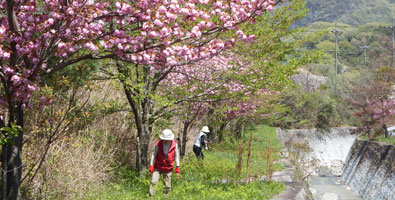 | 「♪今日もせっせと野良稼ぎ〜♪じゃなかった、今日もせっせとイタドリ採り♪」 |