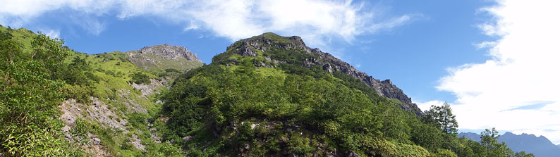 | ブナの木や太いカンバの木が立ち並び太陽を遮断してくれて涼しくていい気持です。倒木を利用した木道やハシゴが点在しよく手入れされた中の湯コースです。ベンチのある草原の平地からは焼岳が見え硫黄の吹き出る煙も見えてきました。「あと半分かな?」笠ケ岳での疲労も回復したのでしょうか、この日の足取りは軽やかです。標識らしい標識は何もなく辛うじて沢筋に出ると旧道との合流点が確認できました。 |
