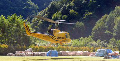 「どうぞ。どうぞ~」バスの中は、いい雰囲気で補助席も満席で約1時間、心臓が口から出そうなほどの悪路を揺られながら標高1120mの地にある椹島ロッジで下車しました。 |