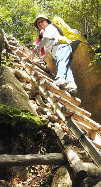 | いつもなら滝の茶屋を過ぎて地獄谷コースに下りていくのですが今日はノーマルルートの「中央稜コース」を選びました。平日なのに駅前広場では通路を占領して30人ほどの団体が記念撮影をしている始末です。前を遮り30分ほどのウオーミングアップコースでもある滝の茶屋まで歩き始めました。湿度が高いのか大汗をかき、しばし休憩してから何年ぶりかの中央稜に挑みました。「やさしいコースを歩いてはダメだっ!難しいコースを行けっ!」と師匠の檄が飛びます。中央稜コースはいつも下りで利用しますが登りは久々で、岩場登りもあり、楽しかったのです。 |