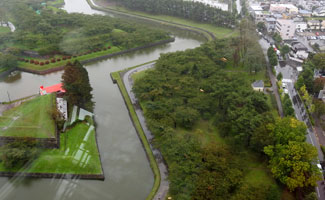 | 函館の街に入り、車を駐車場に停め観光タクシーの利用も考えましたが、まずは五稜郭に行って星形の美しい地形を眺めることにしました。五稜郭は、江戸時代末期に江戸幕府により建造された稜堡式の城郭。元は湿地でネコヤナギが多く生えていた土地であることから、柳野城(やなぎのじょう)の別名を持つ。五稜郭は箱館開港時に函館山の麓に置かれた箱館奉行所の移転先として築造されました。しかし1866年の完成からわずか2年後に幕府が崩壊、短期間箱館府が使用した後、箱館戦争で旧幕府軍に占領され、その本拠となりました。1914年から五稜郭公園として一般開放され、以来、函館市民の憩いの場とともに函館を代表する観光地となっています。 |