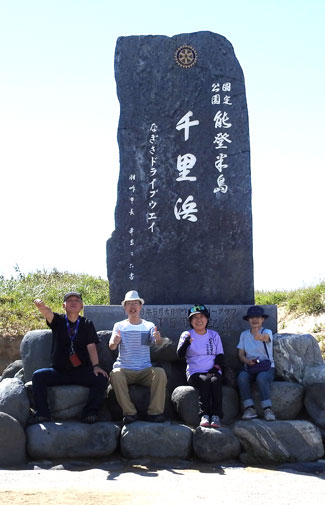 | 大阪へ向けて走る途中の千里浜なぎさドライブウエイで休憩タイムを取りました。千里浜なぎさドライブウェイは延長約8mの観光道路で日本で唯一、一般の自動車やバスでも海岸線の砂浜の波打ち際を走ることができる道路なのです。千里浜は一般の自動車やバスでも砂浜の波打ち際を走ることができるように整備されていて、悪天候ではない限りは年中走行可能であるが、安全確保のためにレジャーシーズンとなる夏季の1か月間は公道として道路標識を設置しているそうです。ハンドルを握りまるで海の中を走っているような爽快さがあり窓を全開にして走り続けました。興奮したなぁ・・・!海の散歩道を走り終え再び高速道路に乗りました。 |