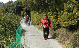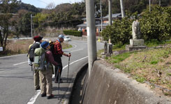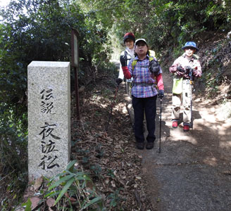 糸我王子からは、いよいよ糸我峠への登りとなります。ゆるい坂道が続き、ミカン畑を上って行くと、道は狭くなり、かなり傾斜もきつくなってきました。車道にでて糸我峠を目指します。ふたたび熊野古道へ入ると今度は下り道となり、峠の茶屋跡の石標がありました。樹林の中を抜けると湯浅の町が目に入ってきました。途中の竹藪の中に「夜泣松」の看板がありました。 『夜泣松の伝説・・・ここには松の大木があったという。平清盛一行の連れていた子が夜泣きするので困っていたが、土地の者から「この地の大きな松の木の皮を燃やして煙を吸わせれば治る。」と聞き、その通り試してみたところ夜泣きが止んだと伝えられています』そこで、その松を「夜泣松」と称したとの伝説があるそうです。しかしいまは松の木はありません。