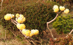 | 峠から山道は続き、途中にお地蔵さまが見守ってくれていました。峠を下ると古い石畳道になりました。全長503mの熊野古道の最長の石畳道だそうです。石畳みが終わりミカンの木の下を歩いていると陽だまりの屋外レストランをみつけました。「ここでお昼にしよう!」と芝生の心地よい土手に座り込みました。デザートのみかんも美味しかったです。 お昼時です。 |