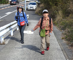 | 今回は7王子を巡ります。印南駅9時40分に出発し「かえる橋」を見ながら前回の熊野古道まで歩き繋ぎました。しばらく歩いていると、途中に斑鳩王子への道標がありました。昔の面影を残す古い町並みを歩いていると住民の人たちが声をかけて下さり「頑張って歩きなさいよ~」の励ましの言葉が嬉しいです。しばらく国道を歩き、やがて急な石段を上って境内に着きました。61番「斑鳩王子」に到着です。 |