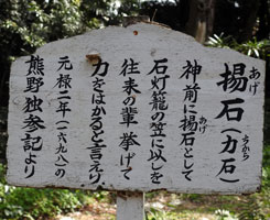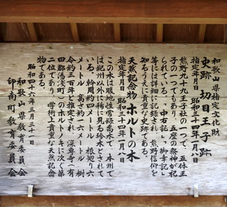 『切目王子には「きな粉の伝説」という伝説が伝えられています。その昔、僧を殺した切目の王子は、捕らえられて右足を切られて山に追放されました。ところが王子は、熊野詣の帰途にある者たちから熊野権現の利生を奪うようになり、参詣者たちを嘆かせました。そこで熊野権現は稲荷大明神と相談し、きな粉で化粧した者には害を及ぼさない旨を約束させたそうです。その後、御託宣があり、参詣者たちはきな粉で化粧をするようになりました。この化粧は実際に行われていたものとみえ、1427年の『熊野詣日記』に額や鼻、頬、おとがいなどにきな粉をつけて王子社の前を通過したとの記述があるそうです』