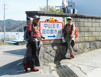 | 切目王子を出ると更にきつい登りになっています。すぐ先に「中山王子 足の宮さん」という道標があり、急な坂道を上りました。63番「切目・中山王子」神社です。神社の鳥居の前に宝筺印塔が二基あり室町時代のものだと記されていました。鳥居をくぐり境内に入ると神社の社殿がありました。この神社は足の宮とも呼ばれるそうです。 |