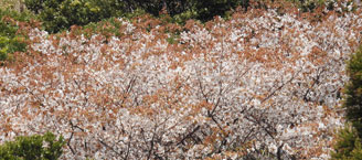 切目王子社の前の細い道を下って行くと集落の中に入ります。切目橋と言う橋を渡りしばらく歩くと切り目駅に到着しました。道なりに突き進みんで行くと「右光明寺、左中山王子」の道標がありました。急な坂道を歩いて行くと、若宮社遺蹟という石碑が立っていました。若宮社は古くから熊野古道、この辺りの守護神として鎮座し、郷人や旅人の信仰を集めたそうです。若宮社遺蹟には新鮮な生花が手向けられており周辺をお掃除しているおばさんに出会いました。道端に咲く白い花の名前をきくと「フランコ」の花でスモモの一種だそうですが桜とは違った美しい花でした。 |