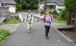 | 市野々王子から歩いていると前日の大雨で被害に遭った家の人たちが荒れ果てた庭の手入れをしていました。「大変でしたね」と声を掛けるとその夜は避難命令が出て学校に避難をしていたそうです。排水溝には流れて辿り着いた落ち葉の山が残っていて道路が川の様になっていた様子がよくわかります。学校帰りの小学生が「コンニチワ」と声をかけてくれました。都会だと「知らない人に声を掛けてはダメ」と言われており声を掛け合うことはありませんが熊野古道界隈の子供たちは、どの子も挨拶をしてくれます。人と人の触れ合いも古道歩きの大事な思い出なのです。 |