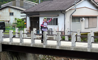| 補陀洛山寺を出て県道歩きをし尼将軍供養塔へ向かいます。道すがらには、平成23年の台風第12号の災害で亡くなった方の立派な慰霊碑が建てられていました。台風の日、観光協会に勤める娘と那智神社の神主さんは結納を交わすことになっていたそうです。しかし台風で若い娘は生命を落とし悲しみに打ちひしがれた神主さんはいつしかこの村から姿を消したそうです。そばを流れる那智川の悲しい出来事は慰霊碑を見るたびに村人たちの心に刻み込まれていることでしょう。 |