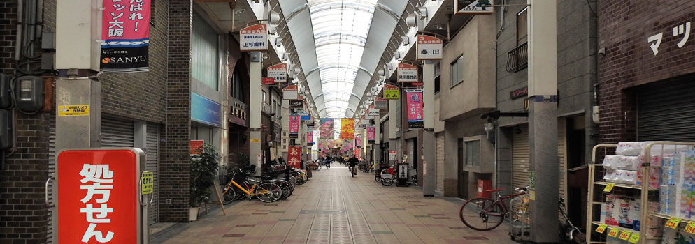 約300メートル、約100店舗の商店街です。大阪ドーム型のシュークリームを売る店があるなど、近鉄バファローズが大阪ドームを本拠地としてから商店街全体でバファローズを応援しており、別名「バファロード」といいます。ここも元は九条新道でした。