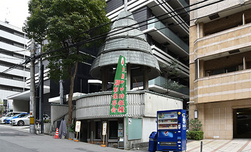 寛永11年(1634)、3代将軍徳 川家光が大坂城を訪れた際、大 坂三郷の地子銀(固定資産税) を永久に免除することを約束し ました。これに感謝した人々は 鐘楼を建て、時刻を報じて永く その恩恵を記念しました。明治 3年(1870)に鐘楼は撤去され ましたが、地元有志の努力によ り昭和60年(1985)元の場所 へ。現在でも1日3回鐘の音を響 かせています。