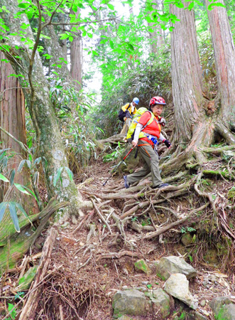 | 大台林道から堂倉滝に向けて下っていきます。 日出ヶ岳から堂倉小屋までの緩いルートとは違い ここから堂倉滝までは傾斜がさらにきつくなり急な石段も崩れたところが随所に見られ歩きにくくなってきます。 |