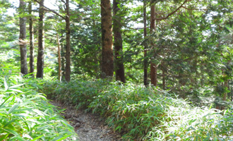 | 宿泊場所の心 湯治館から日出ヶ岳までは イトザサの群生する良く整備された道を上がります。傾斜もそうきつくは無いのですが正木ケ原との分岐を過ぎると木造りの階段が頂上まで続き、急ぐと息切れを起こしてしまいます。 |