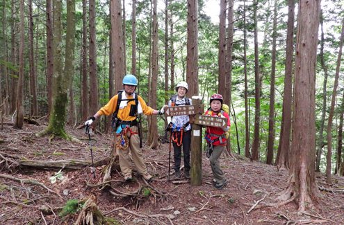 | 心・湯治館を午前7時に出発しました。まずは1時間ほどで日出ヶ岳に到着です。三角点で「デンの記撮影」をしたり、展望台からの景色を堪能しました。ここで簡易ハーネスを付けて、いよいよ大杉谷コースに足を踏み入れました。まずは堂倉滝に向かいます。整備が行き届いた道を進んでいきます。周りにはイトザサが目立つようになり、鹿の食害によると言われる立ち枯れ木も多く見られます。看板でも説明されていますが、この辺り昔は、木々に覆われ、苔なども生えていたようです。が、時が経つにつれ、その姿は大きく変貌をとげてしまったようです。大台ヶ原は、トウヒ林や太平洋型ブナ林など紀伊半島の本来の森林生態系を良く残しているということが資料に書かれていました。 |