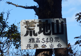 | 午後からのスタートは10分ほどで荒地山(標高549m)の山頂に到着しました。だ~れもいません。かなり広い平らな場所ですが展望がまったくありません。(三角点も基準点もない)荒地山は、その名の通り全山岩肌を露出した粗粒花崗岩で、風化がひどくそんな名前が付いたのだそうです。 |