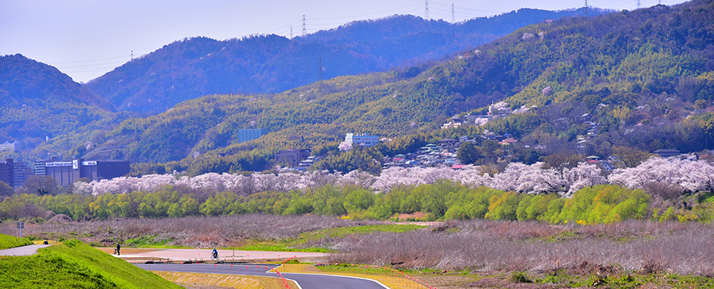 | 後方中央の山は天王山です 横に延びるのは 淀川河川公園背割堤地区 通称背割堤です |