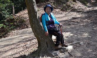 山科からの登山道は倒木だらけで、くぐったり、またいだりと苦労の連続でしたが平坦な登山道より面白くて私は大好きです。悪路は足の置き方、ストックの付き方など自然と身に付くものです。リュックがひっかかっただの、頭を打っただの退屈をしない登りが続きました。どうにか倒木帯を抜けてやれやれと思い歩を進めていると独り歩きのお爺さんが休憩しており「山頂はもう少しですか」と尋ねてみると「まだまだ半分しか歩いておらん」と言われてガクッと疲れが増して休憩です(笑) 汗が噴き出すほどに暑く衣類調整したり水分補給したり、まるで夏日です。先ほど出会ったお爺さんがまだ半分だと言われてから疲れが増し「山で距離を聞いてはいかんなぁ」と反省しました。 |