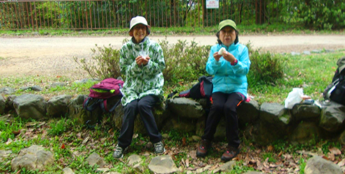 | かつて流通の主流であった荷車が付けた轍の跡に腰を下ろし休憩です。あと少しでゴールのため慌てることなくイタドリを探しながら、見つけたらよじ登りながら道草を楽しみました。琵琶湖疎水のゴールの日向大神宮の一の鳥居が見えてきました。今回は立ち寄らずに地下鉄・蹴上駅手前で解散式をして今回のウオークは終了したことになります。 |